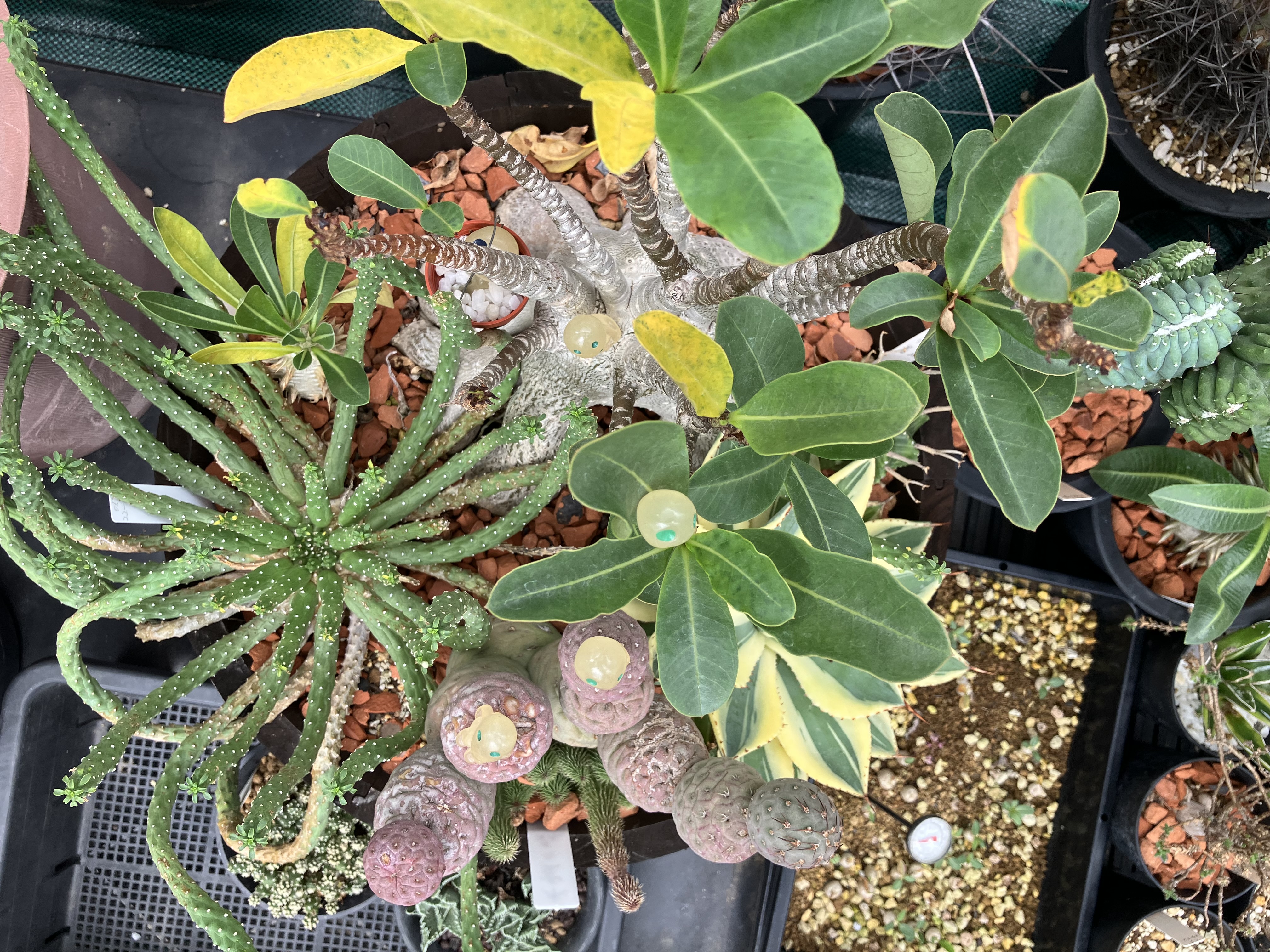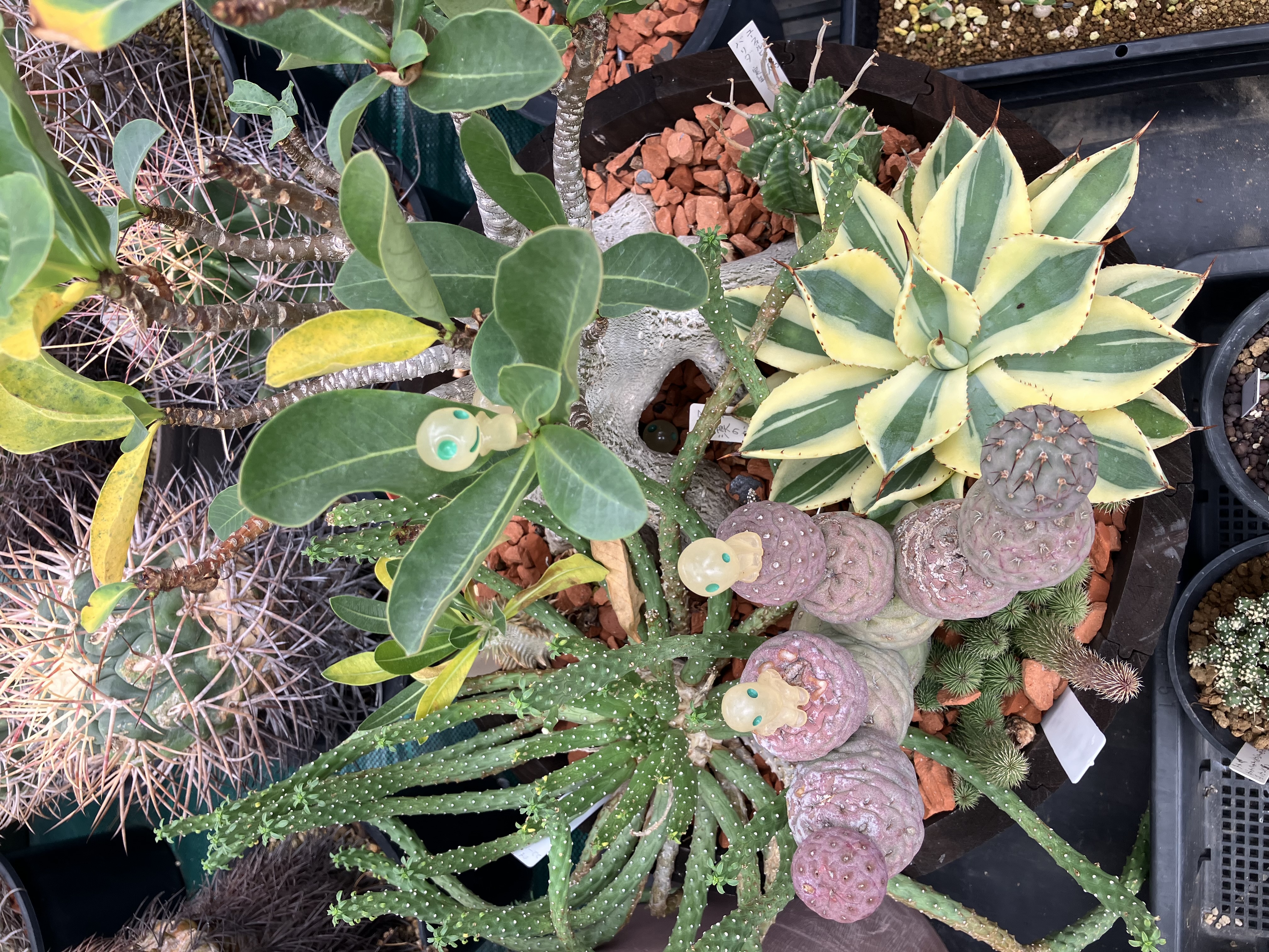 - アデニア ソコトラナムオクトパス、ユーフォルビア 九頭竜、テフロカクタス ゲオメトリクス、アガベ 砂漠のダイアモンド、ユーフォルビア バリダ、パキポディウム エビス大黒、フェルニア 阿修羅