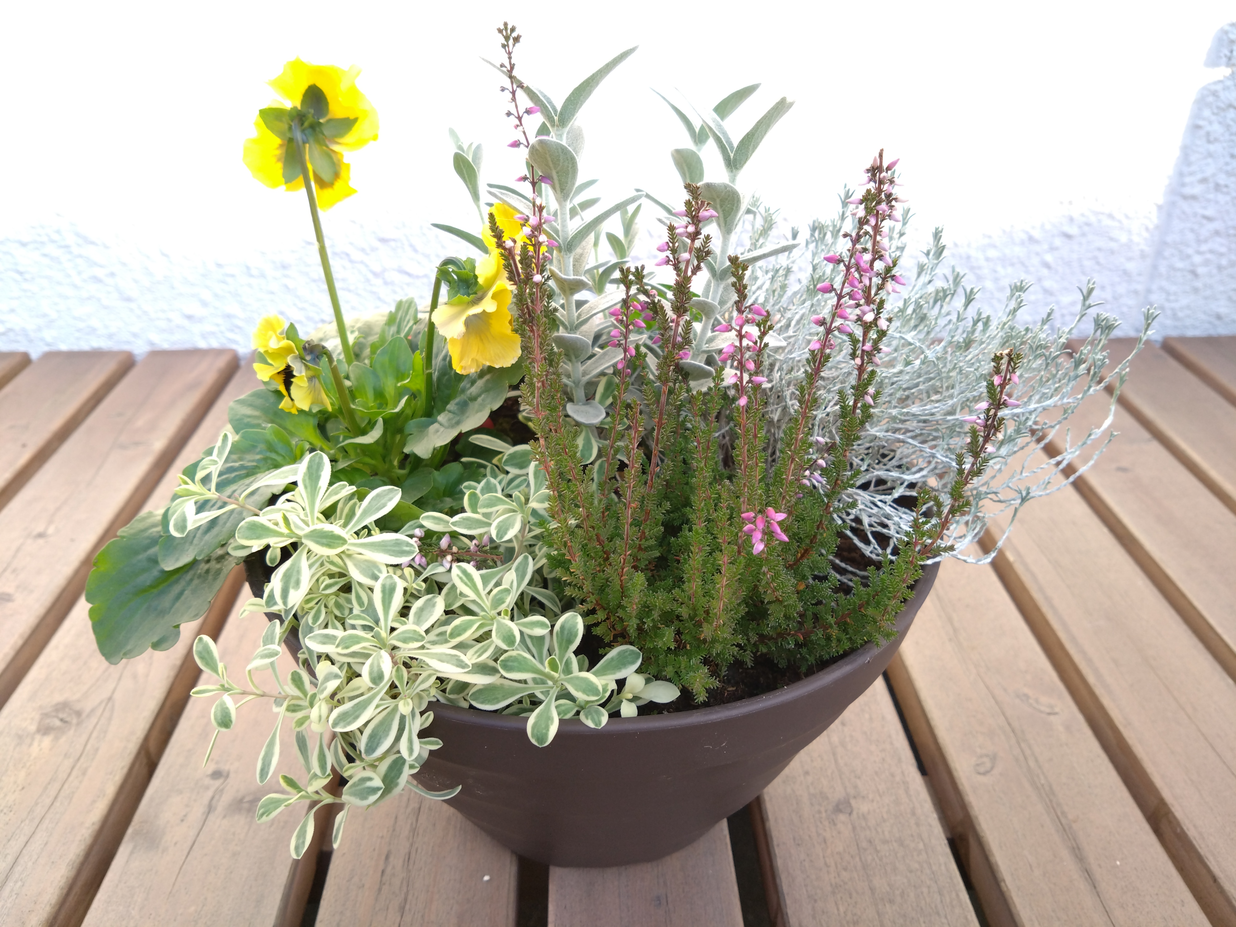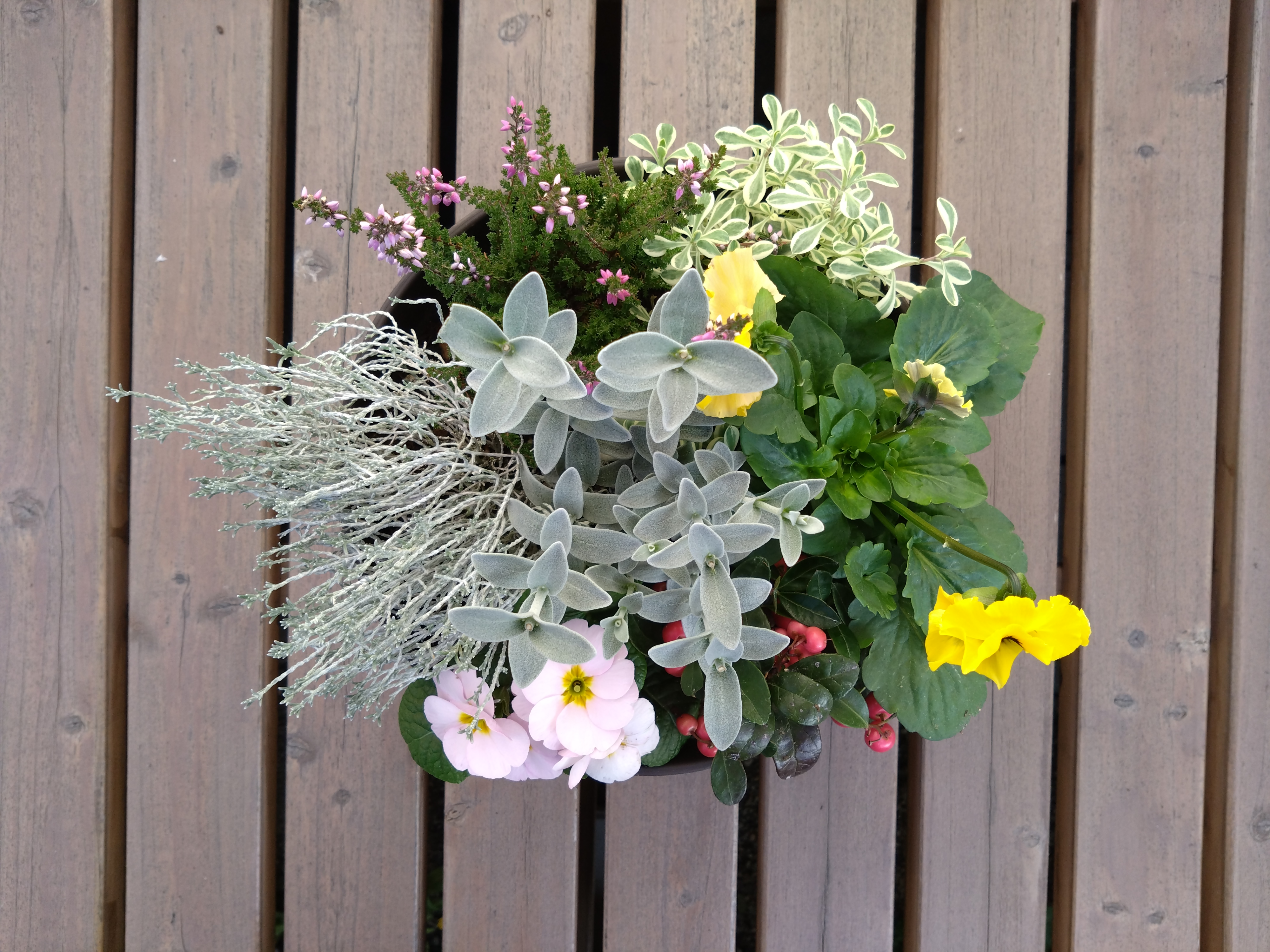 先日多肉の寄せ植えを体験。お花の寄せ植えにも挑戦したくなり早速作ってみました。 色合いや背丈のバランスを取ることに気を付けてみました。 後ろ姿も可愛いでしょう。