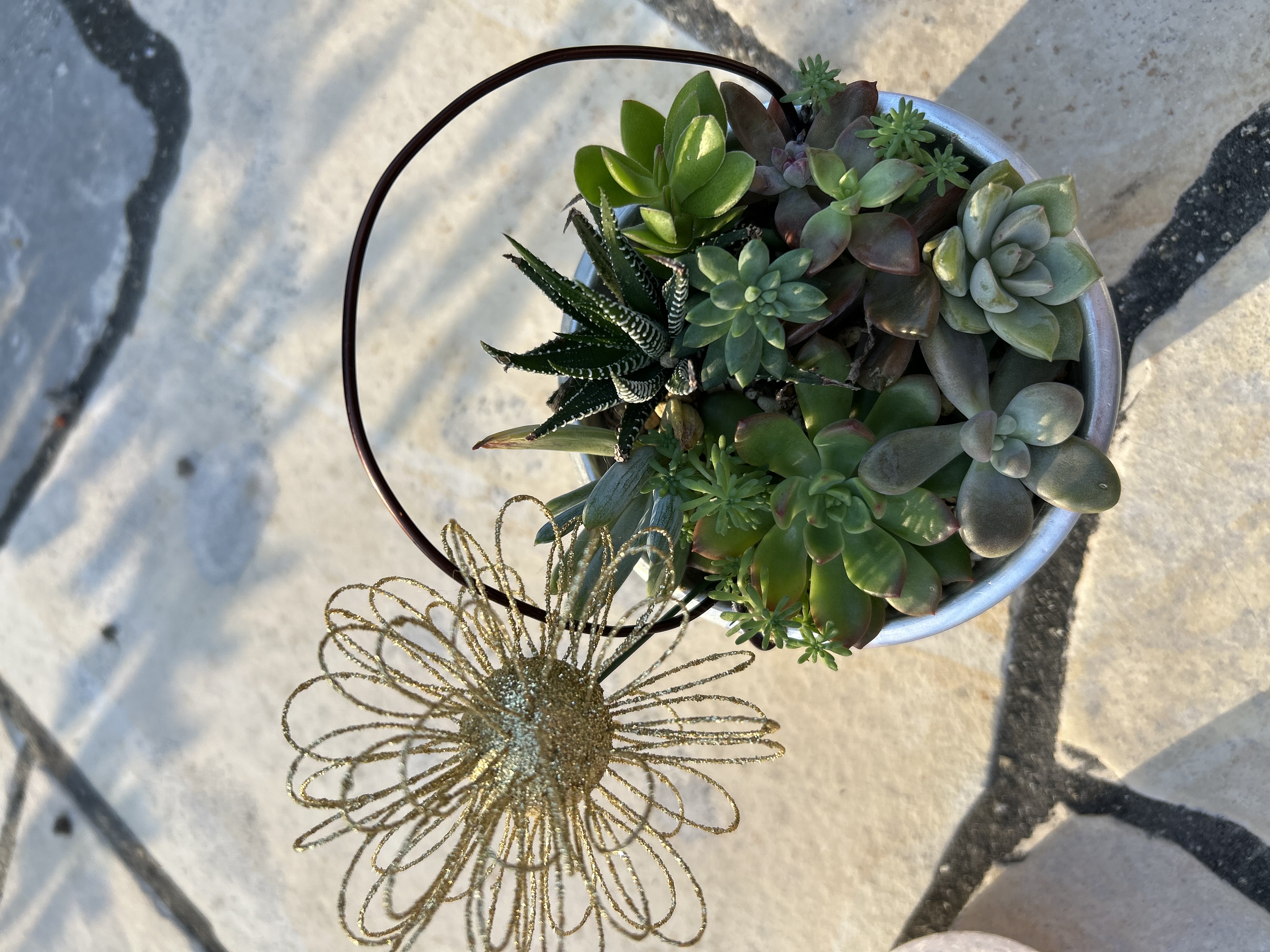 小さな多肉植物をバケツいっぱいに入れました。根付くの良いなぁと、毎日眺めてます。