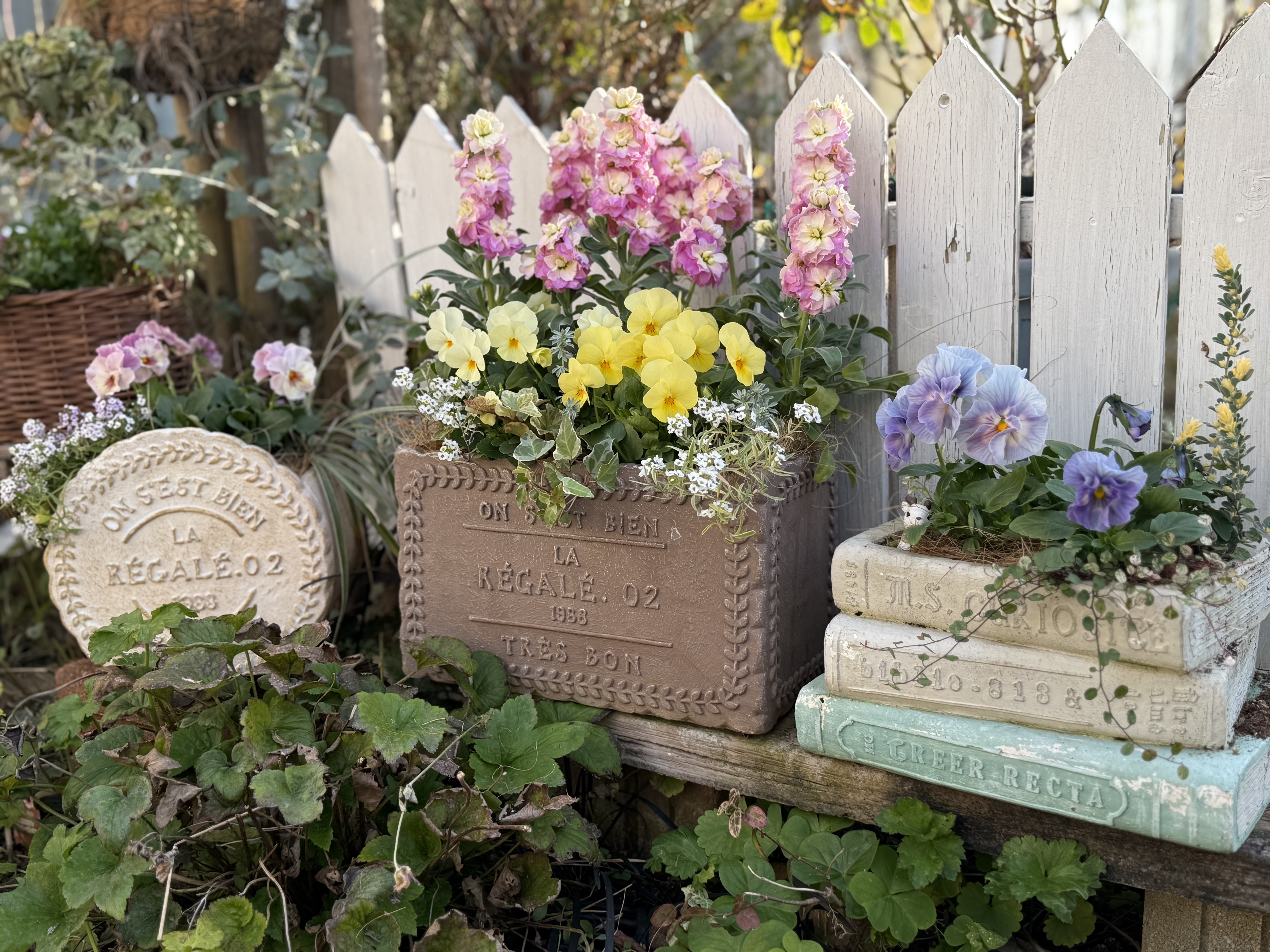 - 冬の庭を明るくしてくれるストックをメインに、淡い黄色のビオラとアリッサムを合わせて、柔らかな陽だまりのような寄せ植えにしました。アイビーの動きでナチュラル感をプラスしています。