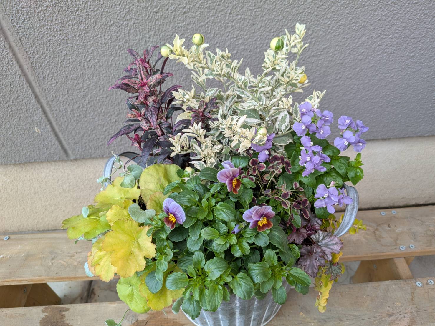 - ずっと欲しかったビオラ「ロステッドチョコレート」がタイムに売っていたので、嬉しくて作ってしまった寄せ植えです。落ち着いた優しい色味のフロステッドチョコレートに合うようにお花を選びました。