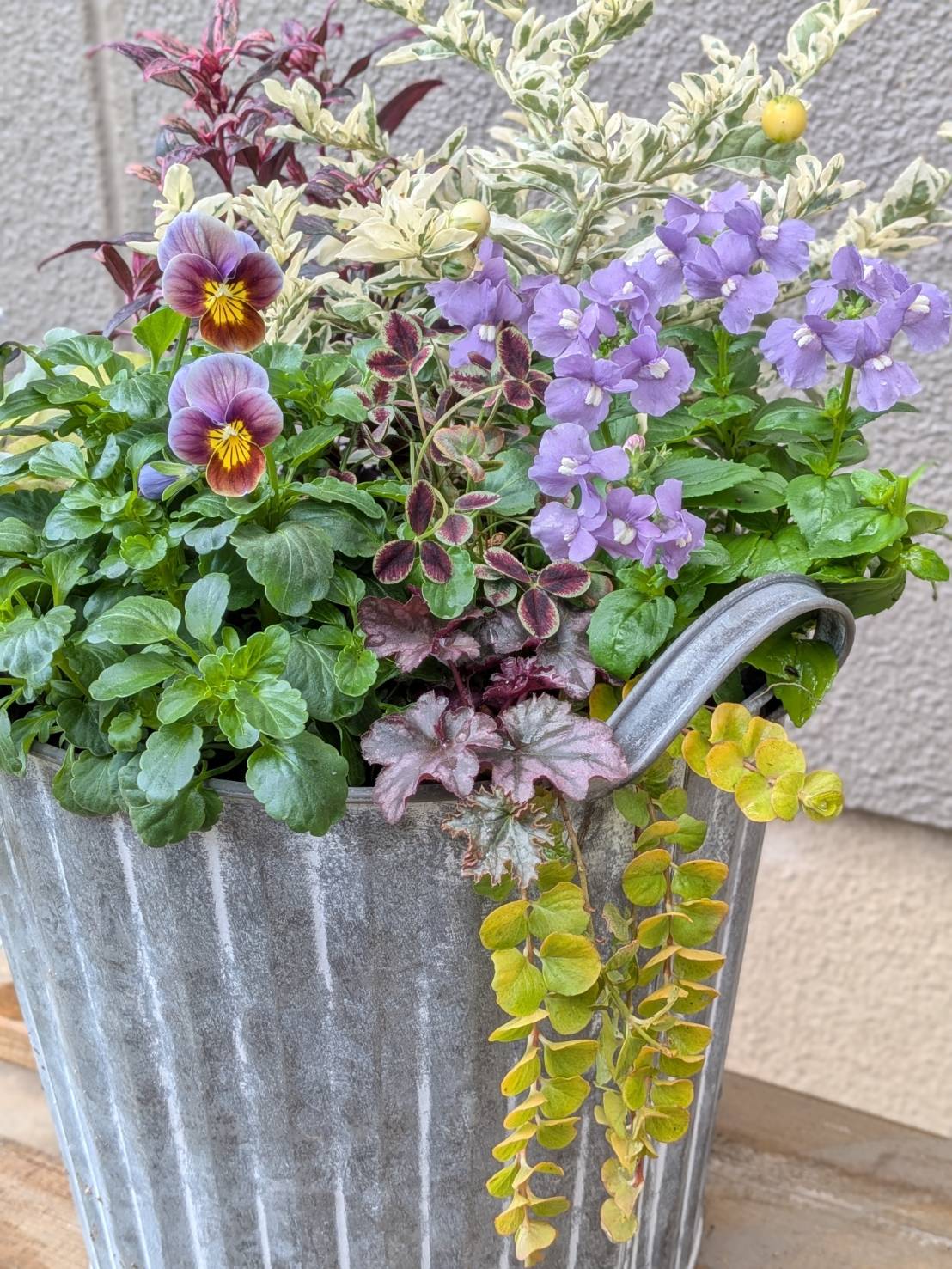 - ビオラフロステッドチョコレート、 斑入りソラナム、金魚草ブランルージュ、 ネメシア、 ディコンドラ、ヒューケラ、クローバー、リシマキアオーレア