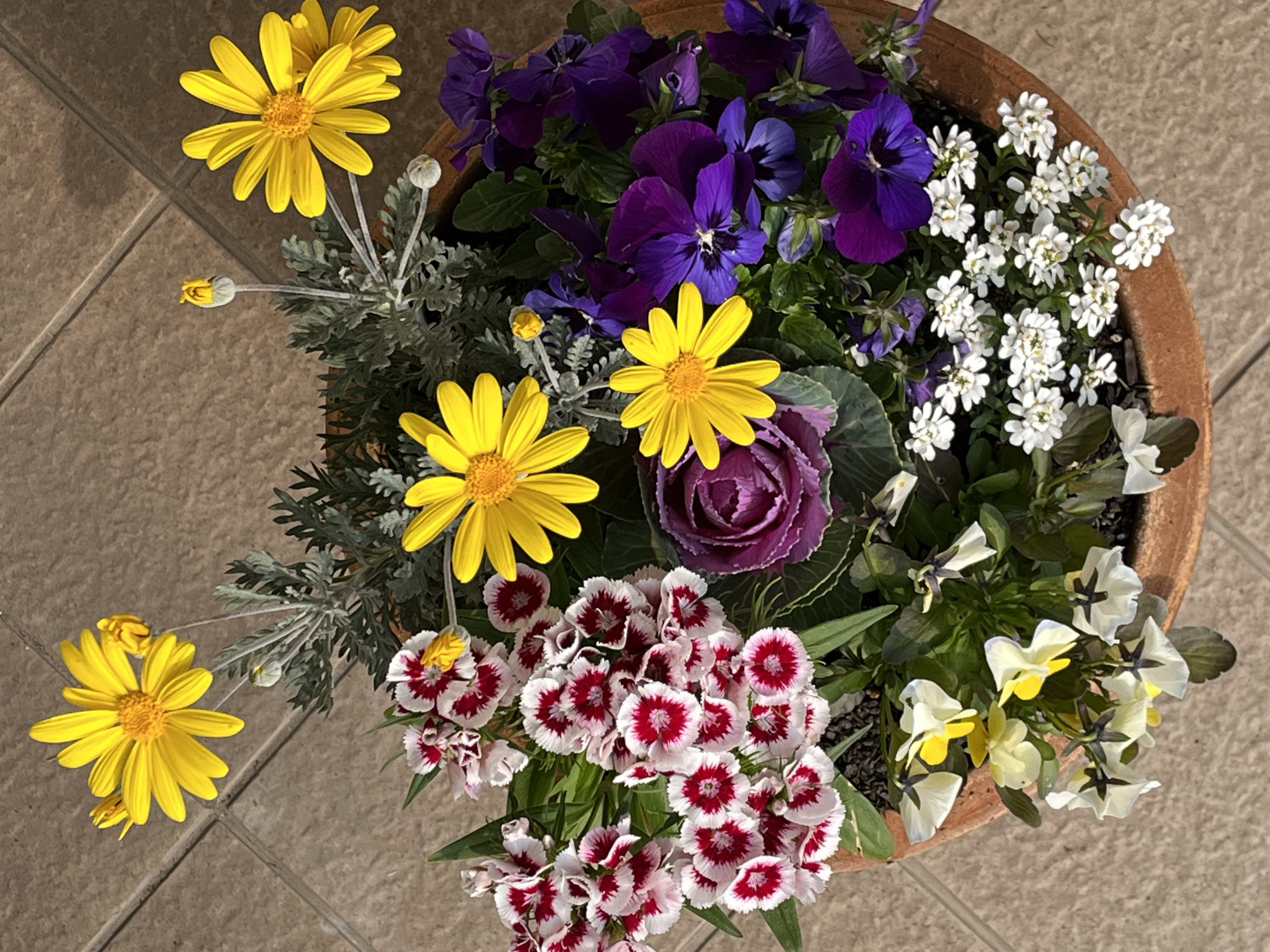 - 葉ボタン、ユリオプスデージー、ナデシコ、ビオラ、イベリス、パンジー