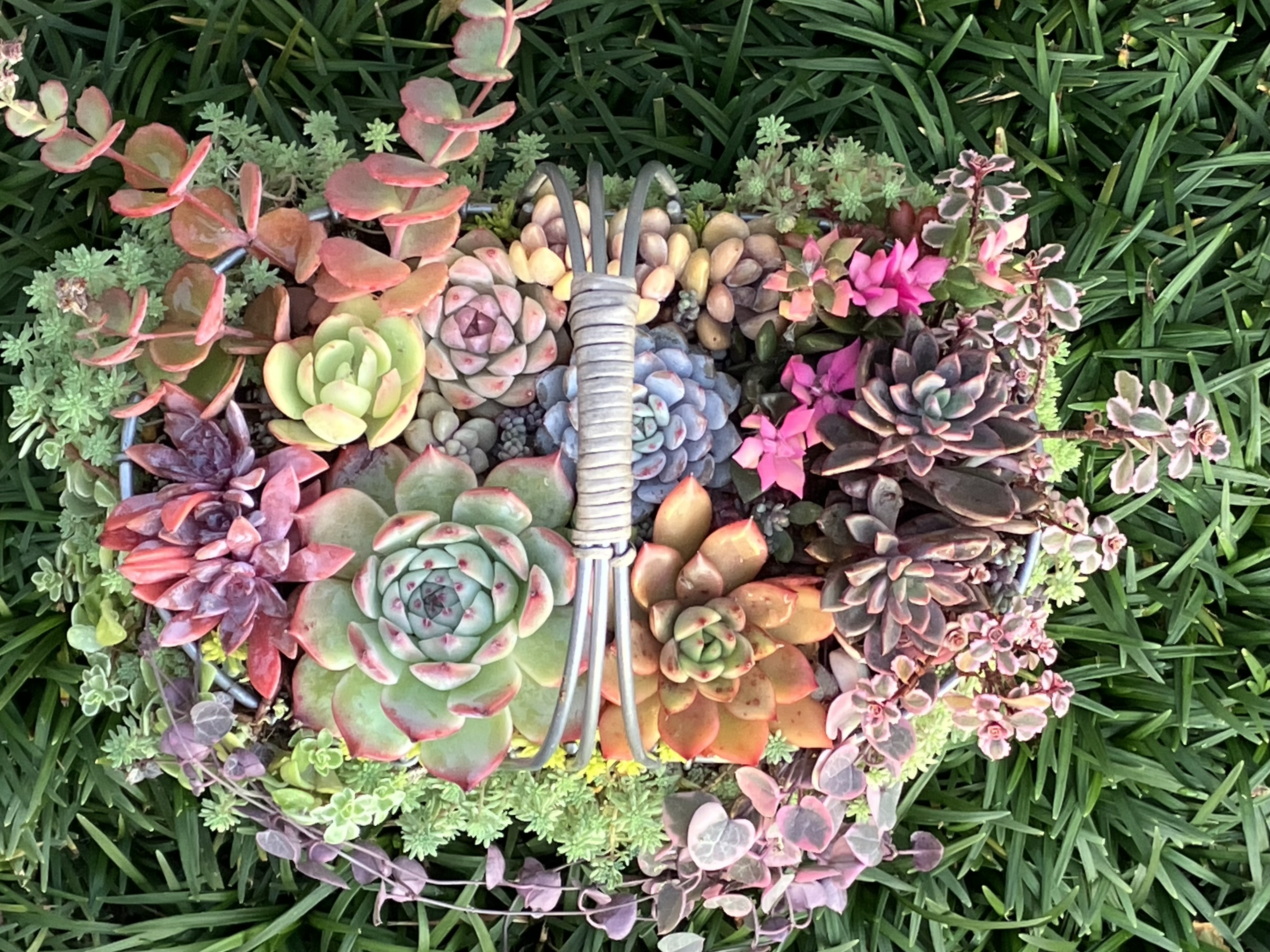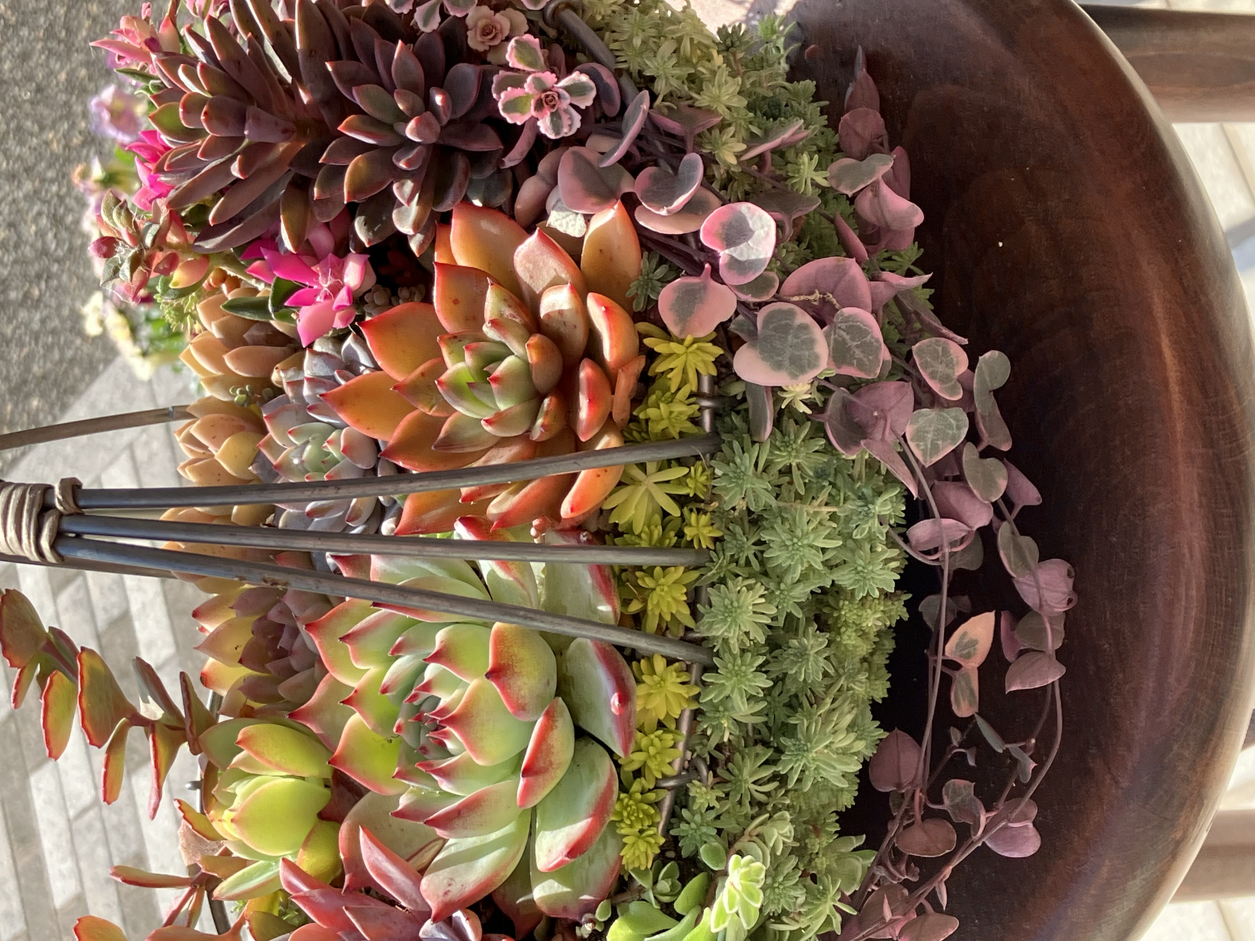 - ベビーティアーズバスケットを夏に枯らしてしまいました。そのバスケットを再利用したいと思い、多肉の寄せ植えを作りました。テーマは「花嫁さん」。かごの側面は暑さ寒さに強いもので、紅葉したときをイメージして斑入りのパリダムを選びました。花嫁さんに似合う可愛らしい多肉を色々集めて作りました。きれいに紅葉したら、こちらのガーデンシェアに写真をアップします。