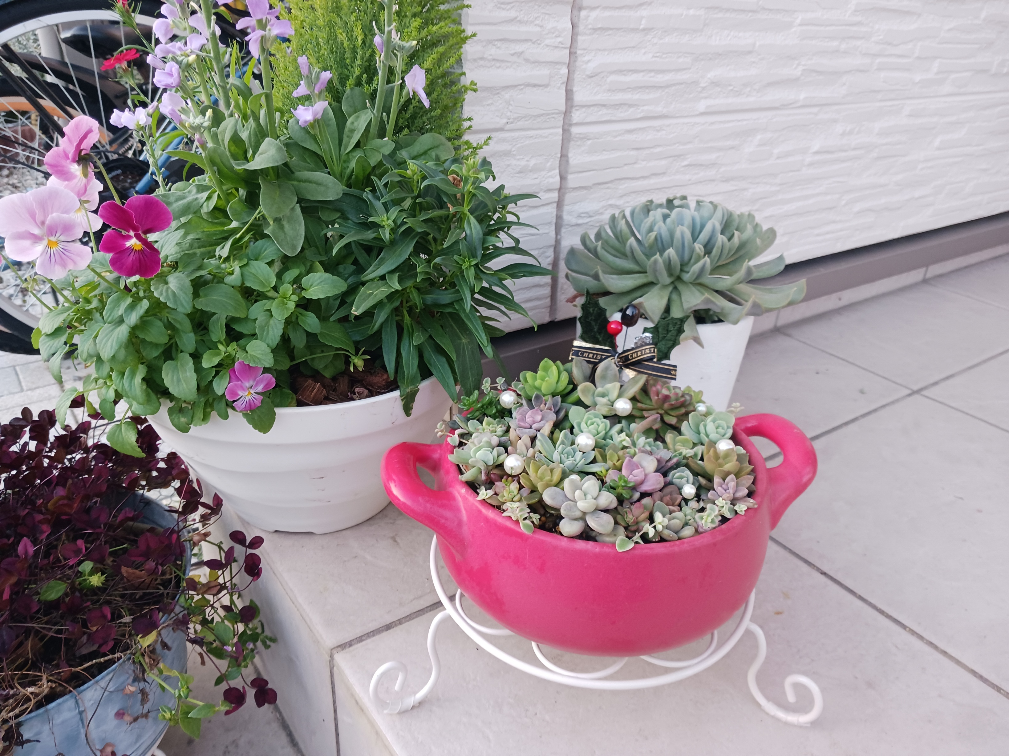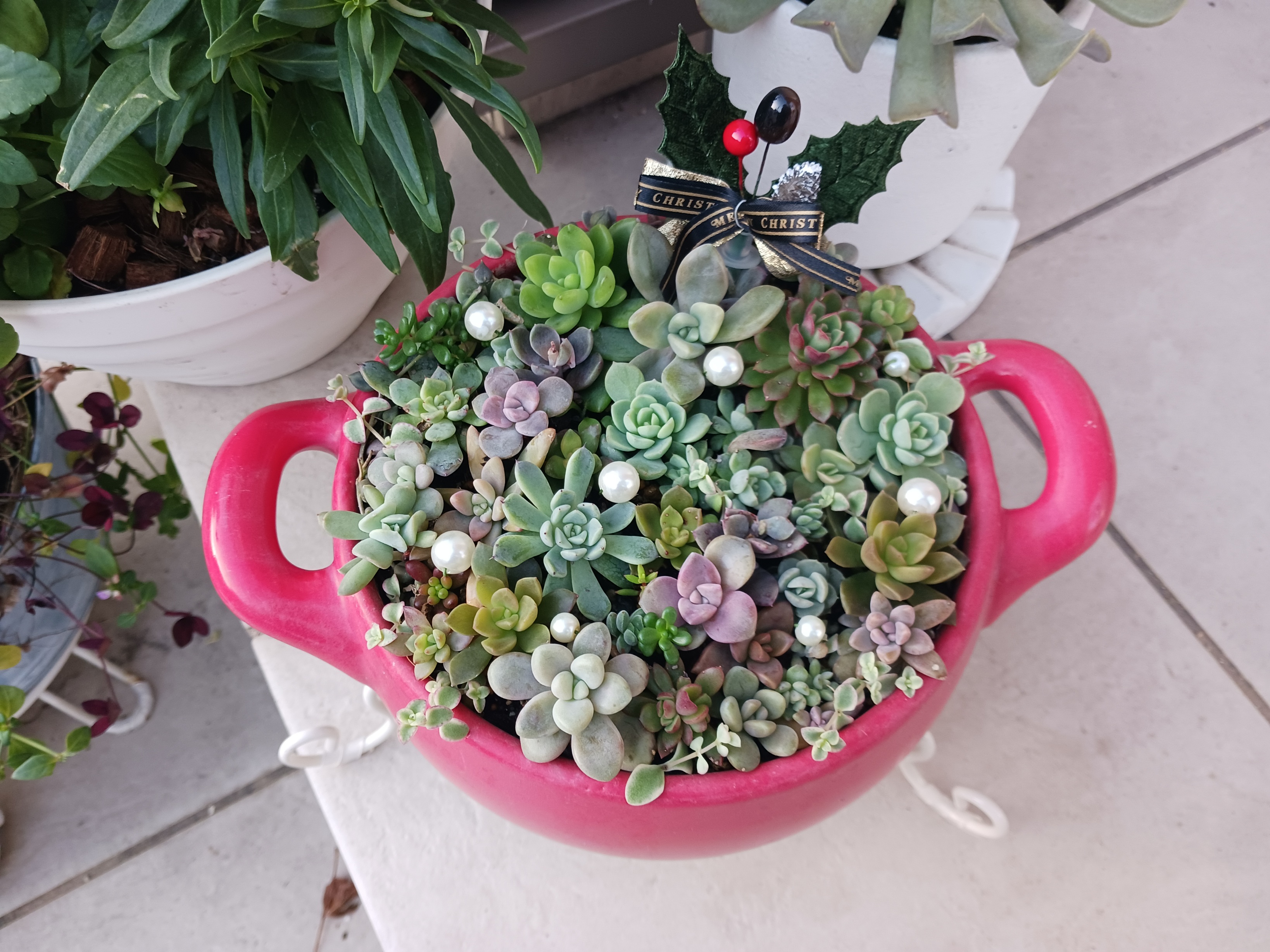 - 葉挿して育った多肉をクリスマス用にアレンジしました。使わなくなったお鍋、手芸で残ったパールビーズ、去年のケーキのピックなど、可愛くて捨てられなかったお気に入りたちが大活躍です。
