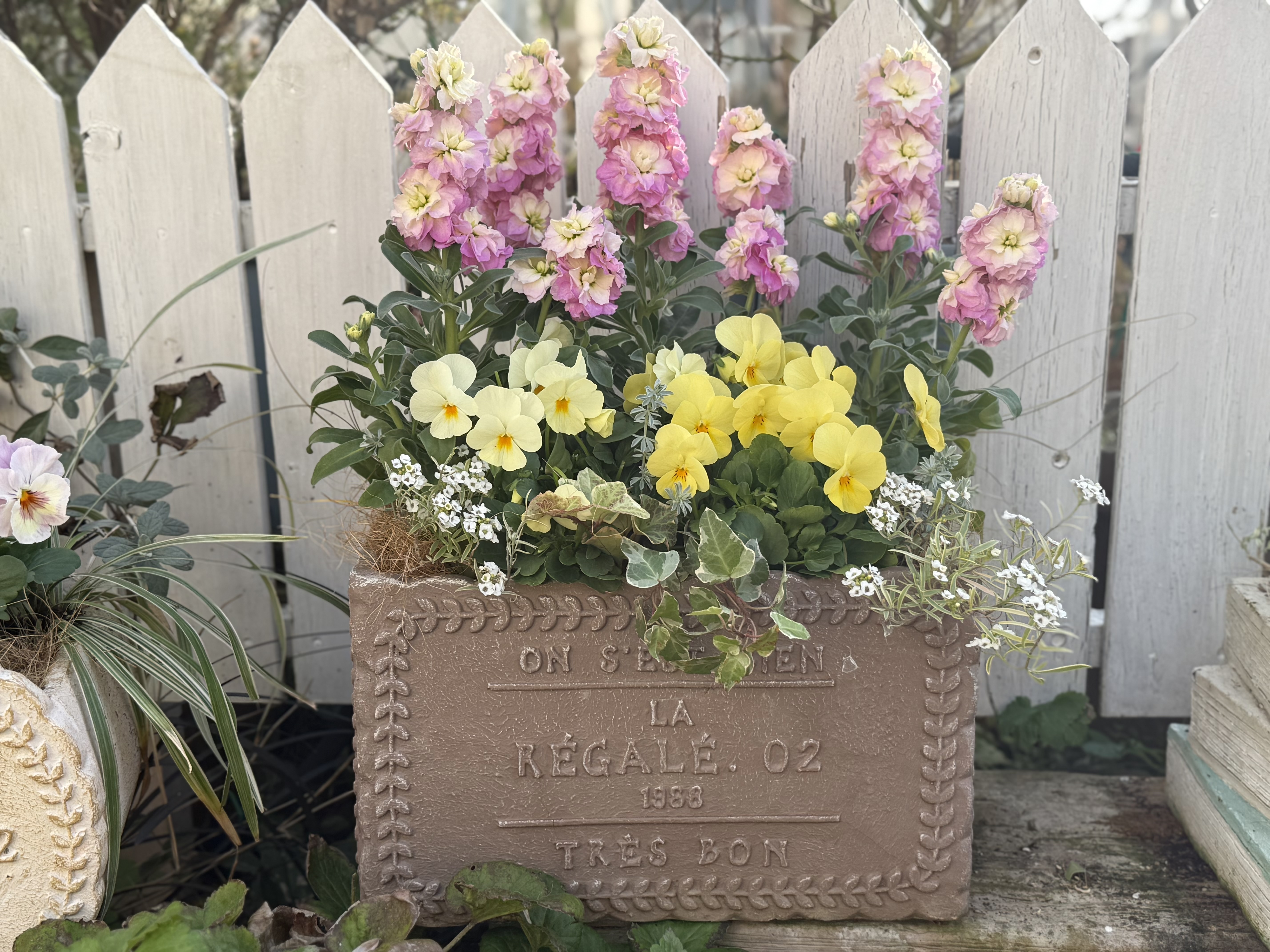 お花部門 - 冬の庭を明るくしてくれるストックをメインに、淡い黄色のビオラとアリッサムを合わせて、柔らかな...
